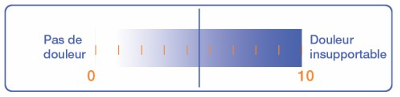 Pour nous aider à mieux adapter votre traitement, vous pouvez nous indiquer “combien” vous avez mal en notant votre douleur de 0 à 10 ou en vous aidant d’une réglette :